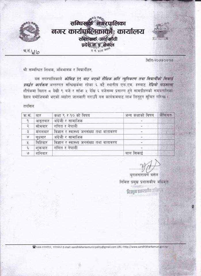 सन्धिखर्क नगरपालिकाले स्थानिय ६ वटा एफ.एमबाट रेडियो पाठशाला शिर्षकमा कक्षा शुरु गर्ने भएको हो ।