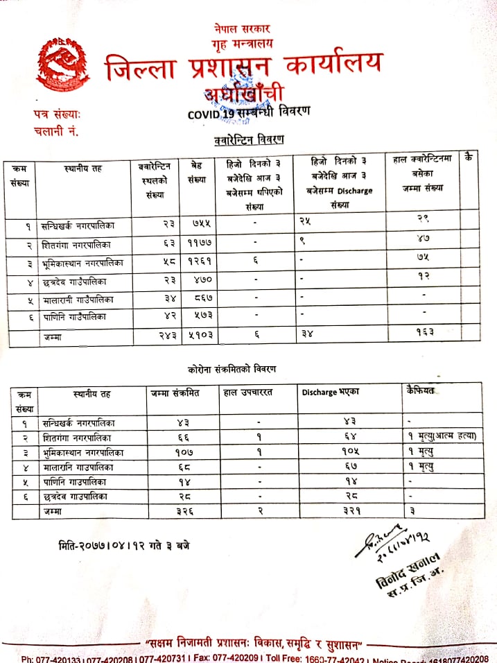 जसमा सन्धिखर्क नगरपालिकामा ४३ जना, शितगंगा नगरपालिकामा ६४, भूमिकास्थान नगरपालिकामा १०५, मालारानीमा ६७, पाणिनी गाउँपालिकामा १४ र छत्रदेव गाउँपालिकामा २८ जना गरि हाल सम्म ३२१ जनाले कोरोनालाई जितेका हुन् ।