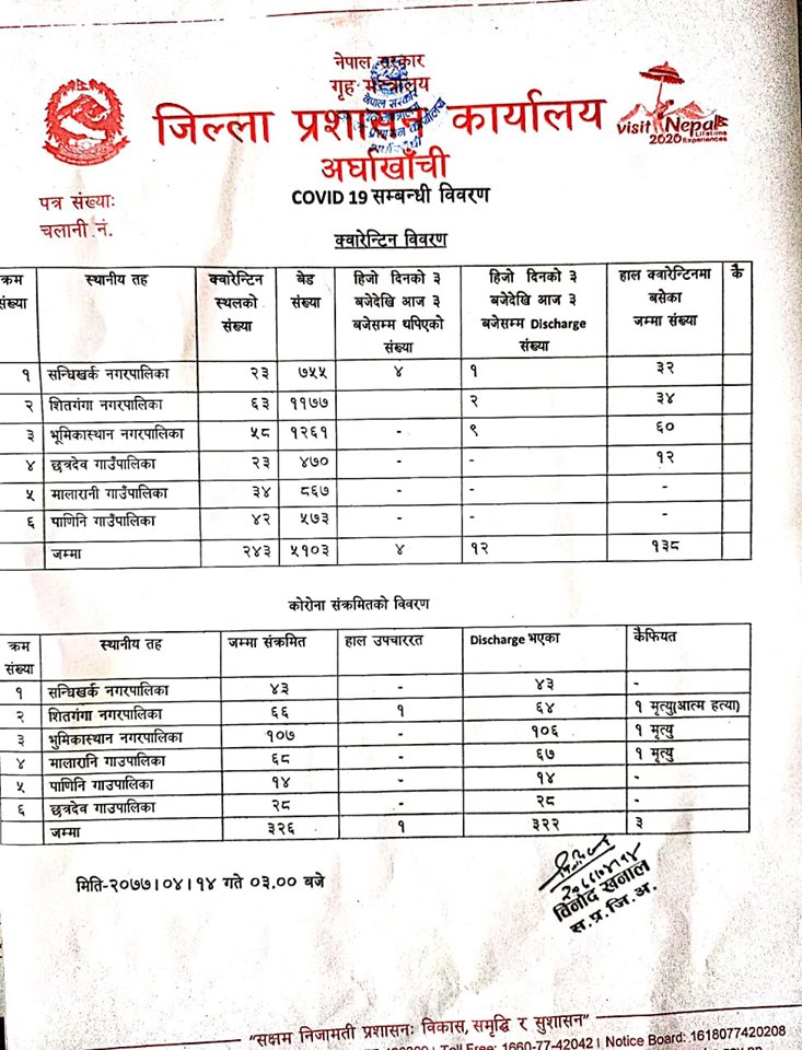 जसमा सन्धिखर्क नगरपालिकामा ४३ जना, शितगंगा नगरपालिकामा ६४,  भूमिकास्थान नगरपालिकामा १०६,  मालारानीमा ६७, पाणिनी गाउँपालिकामा १४ र छत्रदेव गाउँपालिकामा २८ जना गरि  हाल सम्म ३२२ जनाले कोरोनालाई जितेका हुन् ।