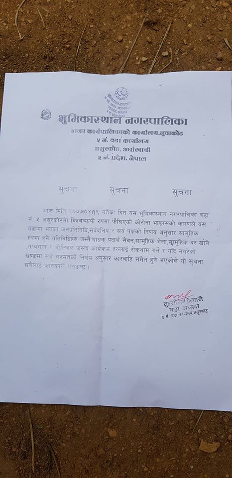 भूमिकास्थान नगरपालिका वार्ड नम्बर ५ असुरकोटले एक विज्ञप्ती जारी गर्दै कोरोनाको महामारीका कारण माधक पदार्थ सेवन, सामुहिक भेला, दरखाने कार्यक्रम तथा तीज गीत कार्यक्रममा प्रतिवन्ध लगाइएको हो ।