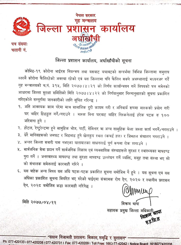 जिल्ला प्रशासन कार्यालयले बिहीवार एक सुचना जारी गर्दै जिल्लामा अबदेखि बिना माक्स बाहिर निस्कनेलाई हरेक पटक १०० रुपैया जरिवाना गरिने भएको हो ।