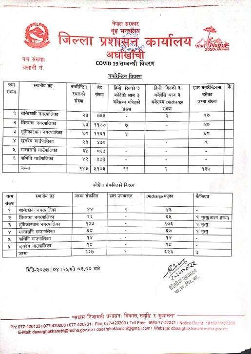 सन्धिखर्क, अर्घाखाँची (अर्घाखाँचीडट्कम) । अर्घाखाँचीमा आईतबारसम्म ३२३ जनाले कोरोना जितेर घर फर्केका छन् । भने १ जना उपचाररत छन् ।
