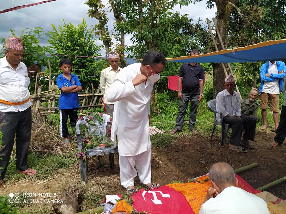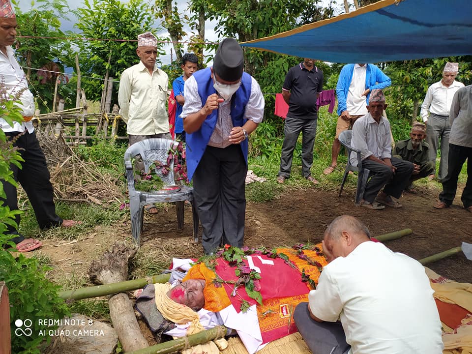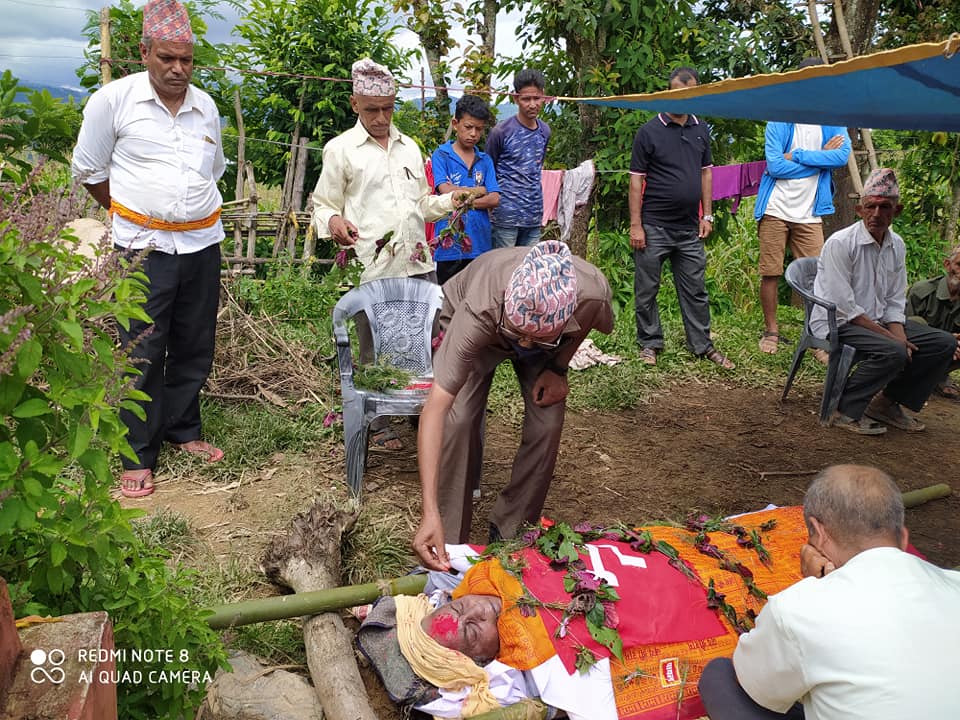 दिवंगत आमाको पार्थिव सरिरमा नेकपाका नेता तथा राष्ट्रियसभाका माननिय सदस्य  चन्द्र बहादुर खड्काले पार्टिको झण्डा अर्पण गरि अन्तिम श्रद्धाञ्जली ब्यक्त गर्नुभयो ।