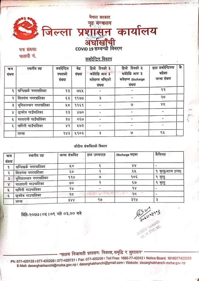 यस्तै अर्घाखाँचीमा मंगलबारसम्म संक्रमितको संख्या ३४४ जना पुगेको छ । जसमा सन्धिखर्क नगरपालिकामा ५० जना, शितगंगा नगरपालिकामा ६८, भूमिकास्थान नगरपालिकामा ११४, मालारानीमा ७०, पाणिनी गाउँपालिकामा १४ र छत्रदेव गाउँपालिकामा २८ जना गरि अर्घाखाँचीमा हालसम्म ३४४ जना संक्रमित रहेका छन् ।