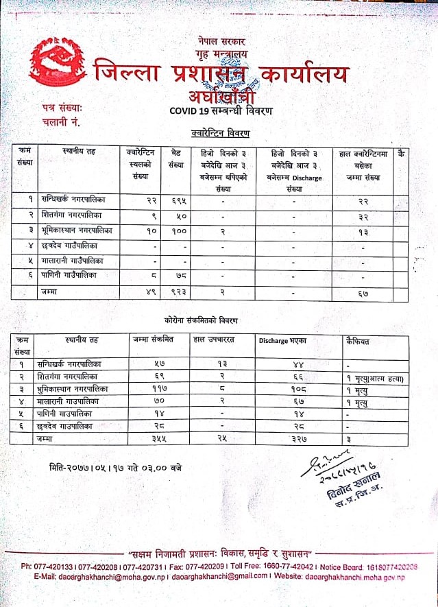 अर्घाखाँचीमा बिहीवारसम्म संक्रमितको संख्या ३५५, आईसोलेशनमा २५ जना उपचाररत, ३२७ जनाले कोरोना जितेर घर फर्के (सम्पूर्ण विवरण सहित)