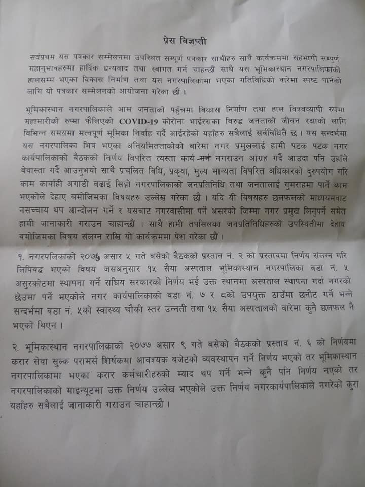 ‘माइन्युटमा उक्त योजना छेउमा पर्ने भन्दै वडा नम्बर ७ र ८ को बीचमा १५ शैयाको अस्पताल बनाउने भनेर निर्णय भएछ’, नगर उपप्रमुख बेल्वासेले भन्नुभयो, ‘नगर प्रमुखले एकलाैटी रुपमा छलफल नै नभएका विषय माइन्युटमा लिनुभएको छ ।’