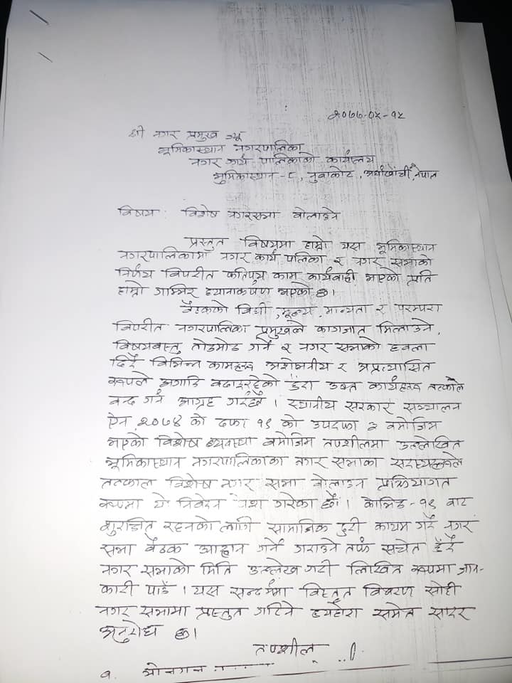 नगर प्रमुखले छलफल नै नभएको विषय माइन्युटमा छिराएर एकलाैटी काम गर्न खोजेको भन्दै अर्घाखाँचीको भूमिकास्थान नगरपालिकाका जनप्रतिनिधिहरुले विशेष नगर सभा बोलाउन माग गरेका छन् ।