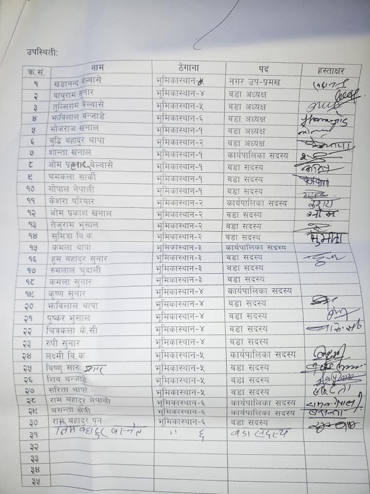 बेल्वासे, वडा नम्वर ४ का वडा अध्यक्ष तथा नगरपालिकाका प्रवक्ता बाबुराम सुनार, वडा नम्बर एकका वडा अध्यक्ष भोजराज खनाल, दुईका वडा अध्यक्ष बुद्धिबहादुर थापा, पाँचका वडा अध्यक्ष तुल्सीराम बेल्वासे, ६ का वडा अध्यक्ष झविलाल बन्जाडे सहित ३१ जना उत्रिएका छन् ।