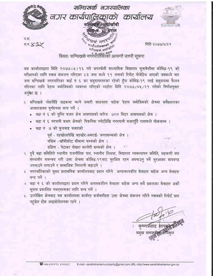 सन्धिखर्क नगरपालिकाले समुदायस्तरमा कोरोना पुगेकाले वार्डलाई शिल गरिएको सुचनामा उल्लेख गरिएको छ ।