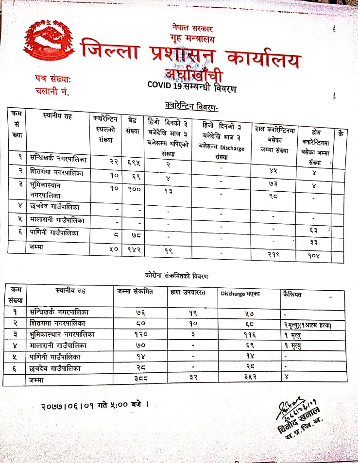 बिहीवारसम्म जिल्लाका बिभिन्न स्थानका आईसोलेशनमा ३२ जना सक्रिय संक्रमितहरु उपचाररत रहेको जिल्ला प्रशासन कार्यालय अर्घाखाँचीले जनाएको छ ।