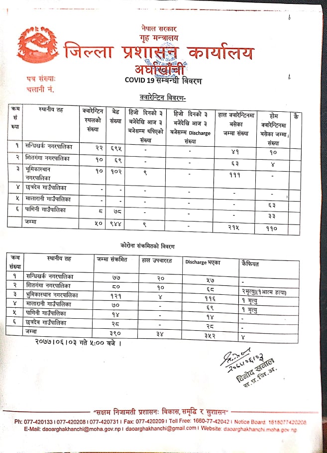 साथै शनिबार दिउँसो ३ बजेसम्ममा २४ घण्टामा ९ जना बिभिन्न क्वारेन्टिनमा भित्रिएका छन् । अर्घाखाँचीका ६ वटा स्थानिय ५० स्थानमा ९४४ वटा बेड सहितको क्वारेन्टिन स्थापना गरि भारत लगायतका ठाउँबाट आएकाहरुलाई क्वारेन्टिनमा राख्ने र पिसिआर परिक्षणमा रिर्पोट पोजेटिभ देखिएमा आइसोलेशनमा पठाउने गरेका छन् ।
