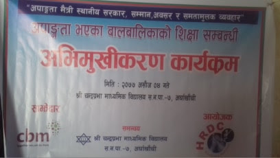 कार्यक्रम विद्यालयका प्रअ दिन बहादुर थापाको अध्यक्षता शिक्षक हरी पाण्डेको संचालनमा कार्यक्रम सम्पन्न भएको कार्यक्रम सक्षम परियोजनाको आयोजना चन्द्रप्रभा माध्यमिक बिधालयकको समन्वय सिबिएमको सिबिएमको आर्थिक सहयोगमा कार्यक्रम सम्पन्न गरिएको हो।