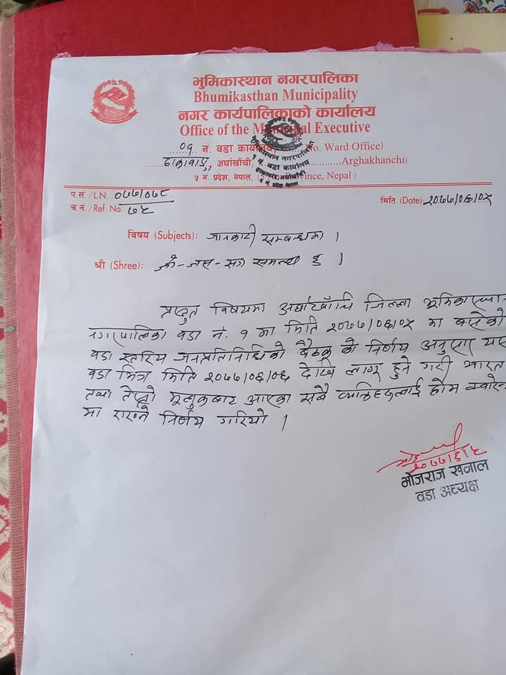 साेमबार भुमिकास्थान नगरपालिका वार्ड नम्बर २ का वडाअध्यक्ष भोज राज खनालको अध्यक्षतामा बसेकाे सर्वपक्षीय बैठकले असाेज ६ गतेदेखि भारत तथा अन्य मुलुकबाट आएका व्यक्ति सिधै १४ दिन हाेम क्वारेन्टाइन बस्नुपर्ने निर्णय गरेकाे हो ।