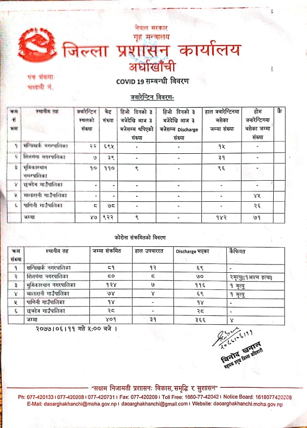अर्घाखाँचीमा मंगलबारसम्म संक्रमित संख्या ४०१ जना, ३६६ जनाले कोरोना जिते, ३१ जना उपचाररत (सम्पूर्ण विवरण सहित)