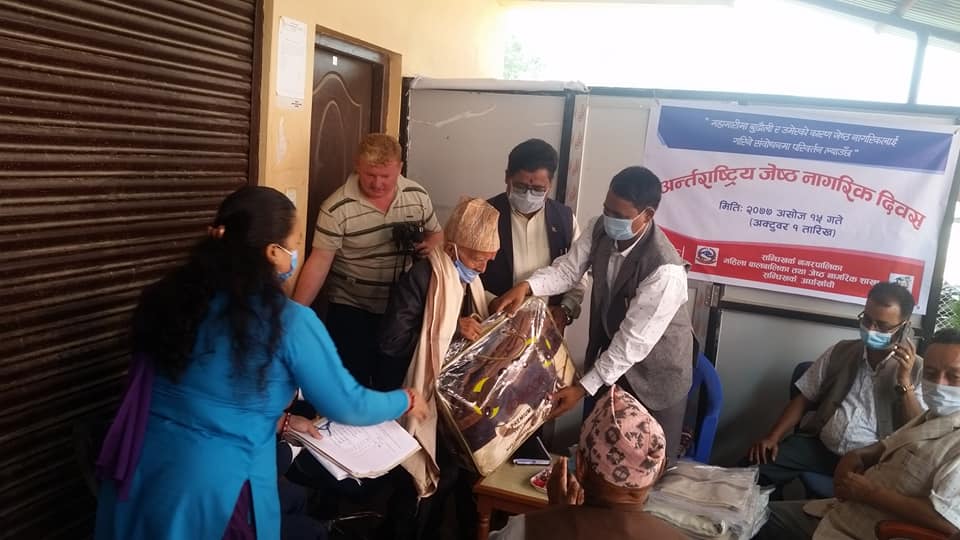 ज्येष्ठ नागरिकहरुलाइ नगरपालिकाले दोसल्ला ओढाएर बलांकेट प्रदान गरी सम्मान गरेको हो । वडा नम्वर १ र २ का ८ जनालाइ सन्धिखर्क नगरपालिकामा र ६ र ७ का ५ जनलाई फुद्वांग बजारमा सम्मान गरेको हो ।