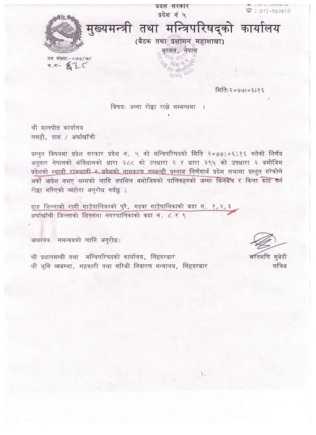 मुख्यमन्त्री र मन्त्री परिषदको कार्यालयका अनुसार प्रदेश ५ को राजधानी प्रस्ताव भएको ठाउँ शितगंगा गाउँपालिका वार्ड नम्बर ८ जलुके, ९ सिद्धारामा जग्गा किनबेच र कित्ताकाट गर्न राेक लगाइएको हो । यस्तै दाङको गढवा १,२,३ वार्डमा पनि जग्गा किनबेच र कित्ताकाट गर्न राेक लगाइएको छ ।