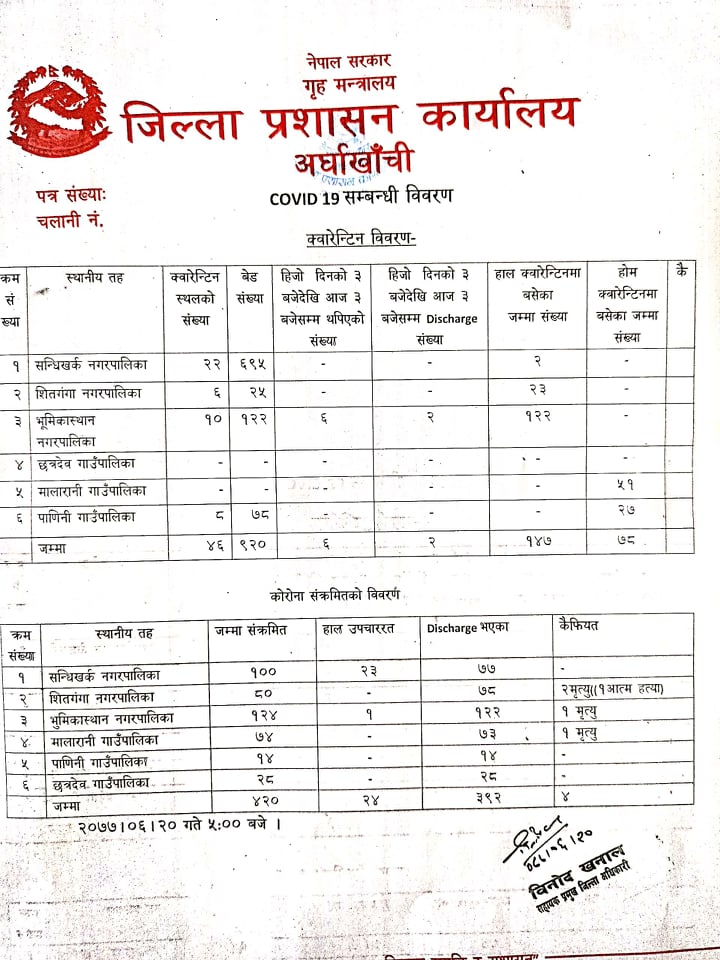 सन्धिखर्क, अर्घाखाँची (अर्घाखाँचीडट्कम) । अर्घाखाँची जिल्लामा संक्रमितको संख्या ४२० जना पुगेको छ । जसमा सन्धिखर्क नगरपालिकामा १०० जना, शितगंगा नगरपालिकामा ८०, भूमिकास्थान नगरपालिकामा १२४, मालारानीमा ७४, पाणिनी गाउँपालिकामा १४ र छत्रदेव गाउँपालिकामा २८ जना गरि अर्घाखाँचीमा हालसम्म ४२० जना संक्रमित रहेका छन् ।