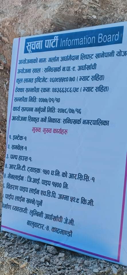 १५० घनमिटरको अर्घा मैदान लिफ्ट खानेपानी आयोजना आगामी वर्ष २०७८ कार्तिक १६ गते भित्रमा सम्पन्न हुनेछ ।