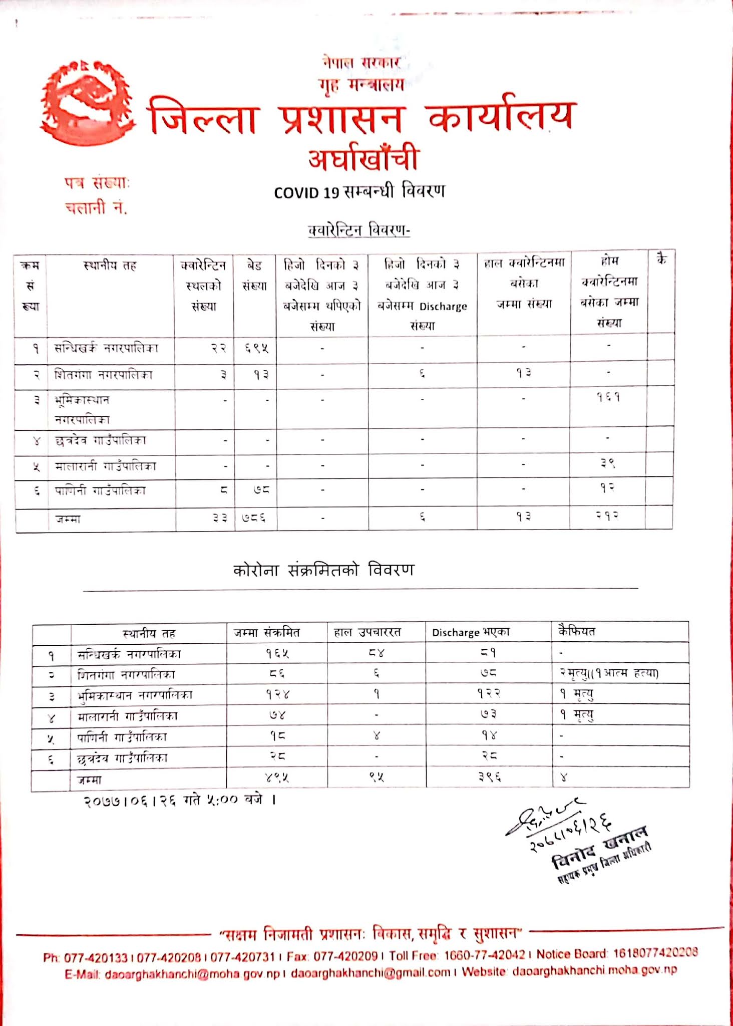 सन्धिखर्क, अर्घाखाँची (अर्घाखाँचीडट्कम) । अर्घाखाँची जिल्लामा ९ जना कोरोना संक्रमित थपिएका छन् । योसँगै अर्घाखाँची जिल्लामा संक्रमितको संख्या ४९५ जना पुगेको छ । जसमा सन्धिखर्क नगरपालिकामा १६५, जना, शितगंगा नगरपालिकामा ८६, भूमिकास्थान नगरपालिकामा १२४, मालारानीमा ७४, पाणिनी गाउँपालिकामा १८ र छत्रदेव गाउँपालिकामा २८ जना गरि अर्घाखाँचीमा हालसम्म ४९५ जना संक्रमित रहेका छन् ।