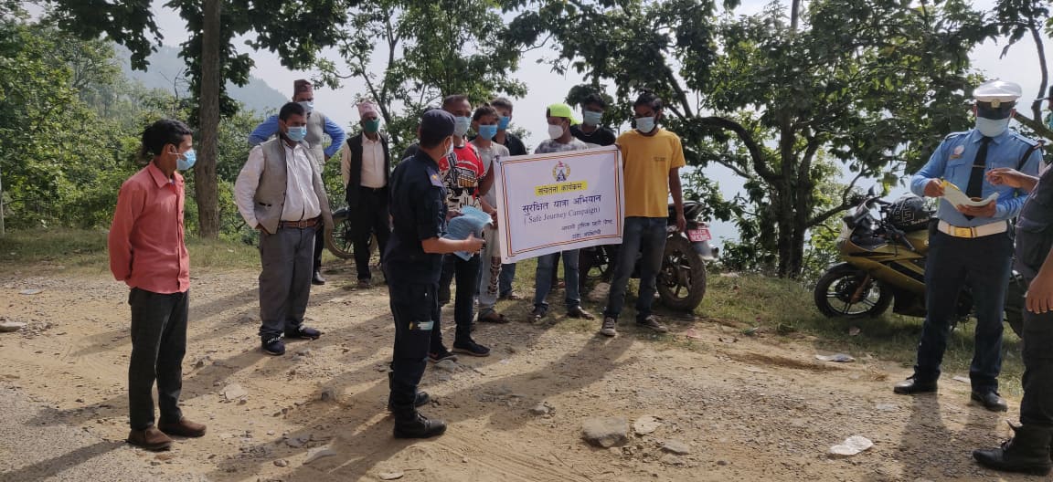 सुरक्षित यात्रा अभियान अन्तरगत आज शितगंगा नगरपालिका वार्ड नं. १२ ठाडाको कोप्चेवास स्थित गोरुसिङगे सन्धिखर्क सडक खण्डमा ईलाका प्रहरी कार्यालय ठाडासँग अस्थाई ट्राफिक प्रहरी पोष्ट ठाडाबाट खटिएको संयुक्त चेकिङ टोलीले बिभिन्न सवारी साधन चेकजाँचको क्रममा चालक ,सह-चालक गरी ३५ जनालाई कोरोनाको समयमा चालक र यात्रुहरुले कायम गर्नु पर्ने दुरी, मास्क , सेनिटाईजर प्रयोग लगाएत बिबिध बिषयमा प्रशिक्षण दिएको हो ।