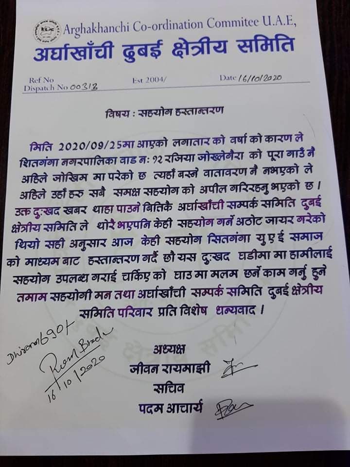 अर्घाखाँची सम्पर्क समिति युएईका केन्द्रीय अध्यक्ष कृष्ण भुसाल, दुवई क्षेत्रीय समितिका अध्यक्ष जीवन रायमाझी,उपाध्यक्ष इस्वरी बन्जाडे र के.पि.न्यौपाने , संरक्षक कृष्ण प्रसाद गैरे , सचीव पदम आचार्य ,कोषाध्यक्ष बलराम न्यौपाने , सदस्य नारायण पान्डे, लगायतको पहलमा सहयोग भएको हो ।