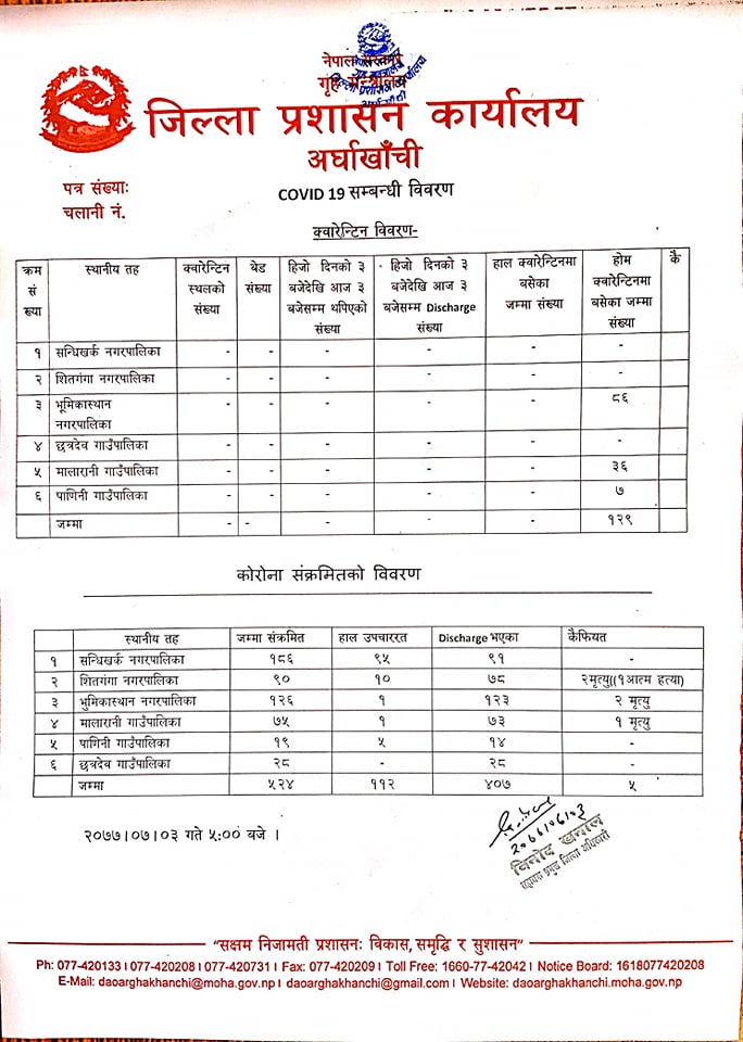 सन्धिखर्क, अर्घाखाँची (अर्घाखाँचीडट्कम) । सन्धिखर्कमा १ जनाले कोरोना जितेका छन् । योसँगै जिल्लाका विभिन्न आईसोलेशनबाट सोमबारसम्म ४०७ जनाले कोरोना जितेर घर फर्केका छन् । जसमा सन्धिखर्क नगरपालिकामा ९० जना, शितगंगा नगरपालिकामा ७८, भूमिकास्थान नगरपालिकामा १२३, मालारानीमा ७३, पाणिनी गाउँपालिकामा १४ र छत्रदेव गाउँपालिकामा २८ जनाले कोरोनालाई जितेका हुन् ।