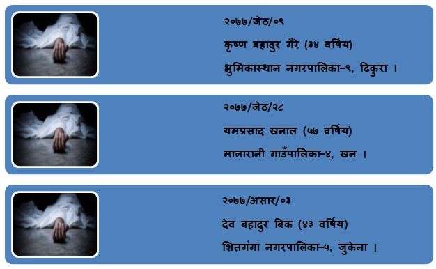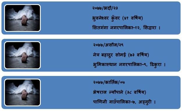 ०७७ जेठ १० गते भारतबाट फर्किएका शितगंगा नगरपालिका-५ जुकेनाका देव बहादुर बिक स्थानिय हरि माविको क्वारेन्टिनमा बसेका थिए । क्वारेन्टाईनमा रहेका उनको आरडिटी परीक्षणमा पोजेटिभ आएपछि जेठ २६ गते स्वाव संकलन गरिएको थियो । पिसिआर रिपोर्ट नआउँदै असार ३ गते बुधबार बिहानपख झुण्डिएर आत्महत्या गरेका थिए। पछी रिपोर्ट आउँदा उनमा संक्रमण पुष्टी भएको थियो ।