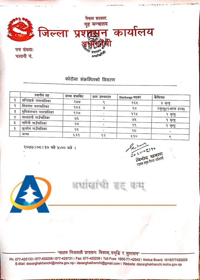 यस्तै जिल्लामा आजसम्म संक्रमितको संख्या ६३१ जना पुगेको छ । जसमा सन्धिखर्क नगरपालिकामा २७७ जना, शितगंगा नगरपालिकामा १०३, भूमिकास्थान नगरपालिकामा १२७, मालारानीमा ७६, पाणिनी गाउँपालिकामा २० र छत्रदेव गाउँपालिकामा २८ जना संक्रमित रहेका छन् ।