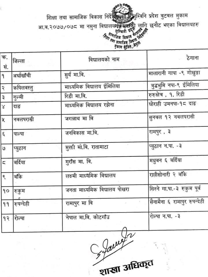 शिक्षा तथा सामाजिक विकास निर्देशानलय लुम्बिनी प्रदेशबाट जारी सुचनामा सुर्य उच्च माध्ध्यामिक विधालय नमुना विद्यालय विकासको लागि छनौट भएको उल्लेख छ ।