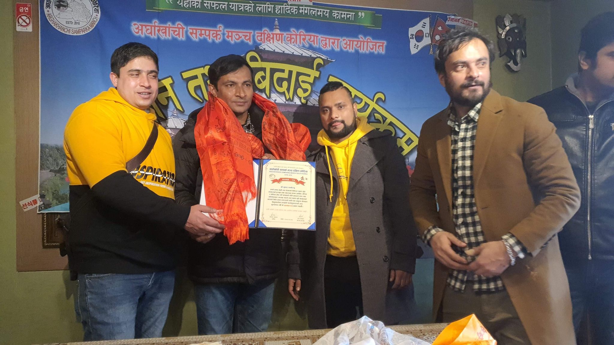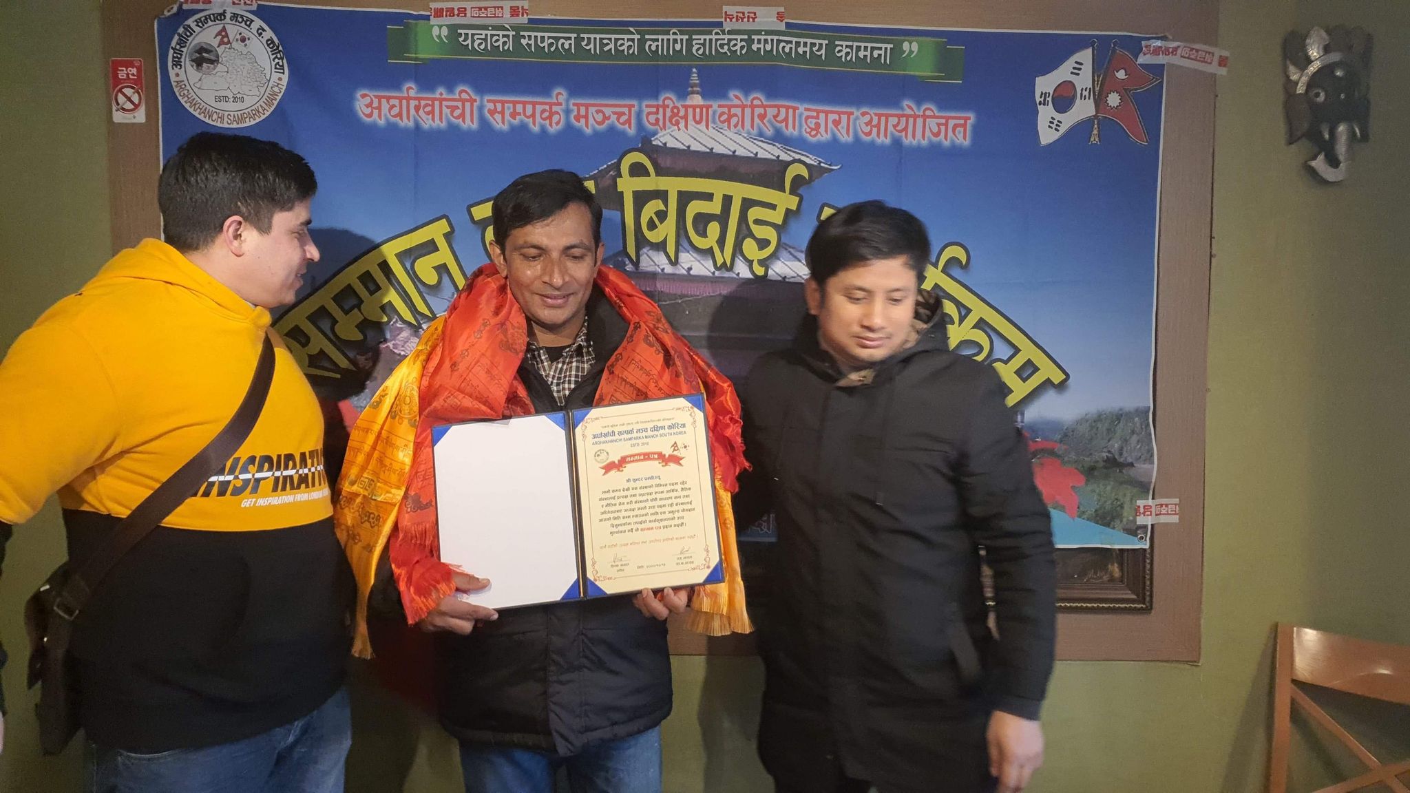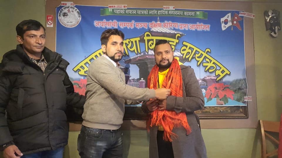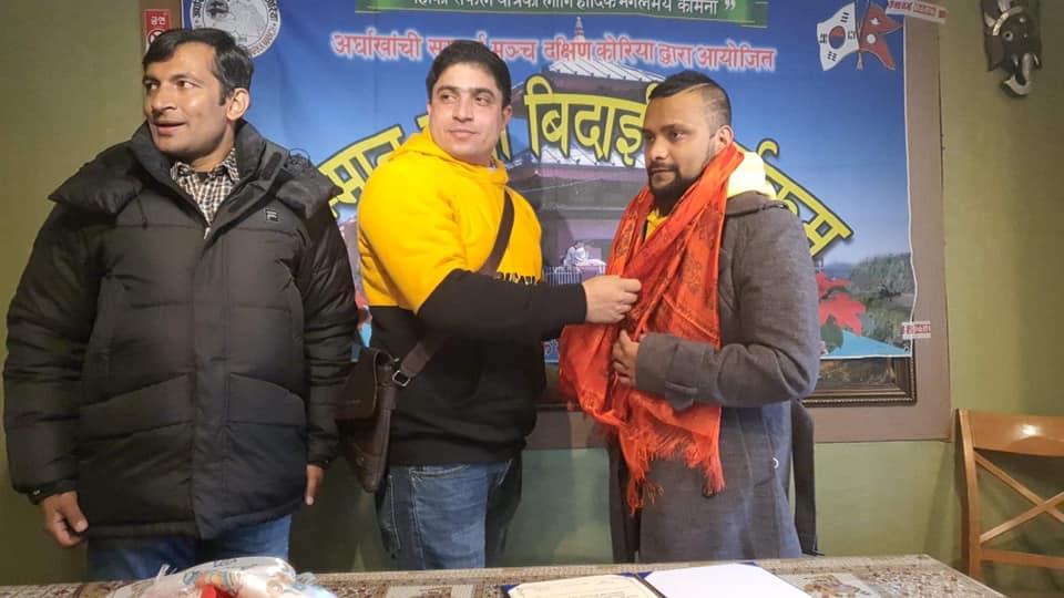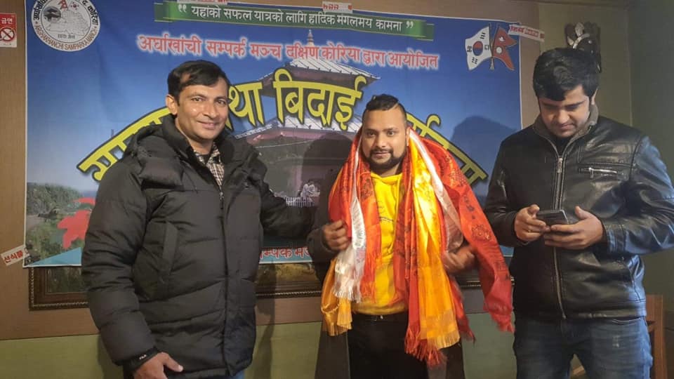 आईतबार अध्यक्ष पन्थीलाई एक कार्यक्रम गरी विदाई गरिएको छ । कार्यक्रम उपस्थिती सबैले पन्थीले अर्घाखाँची सम्पर्क मञ्च दक्षिण कोरियाको अध्यक्ष पदमा रहेर वर्षौसम्म गरेको कामको सराहना गरेका थिए । सो कार्यक्रमका बिच पन्थीले आफ्नो जिम्मेवारी खनाललाई सुम्पिएका थिए ।
