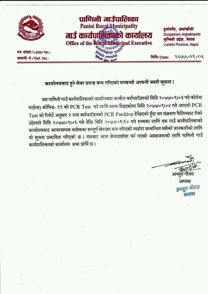 पाणिनी गाउँपालिकामा कार्यरत २ जना कर्मचारीलाई कोरोना संक्रमण भएपछि पालिका कार्यालयका सबै सेवा बन्द गरिएको हो ।