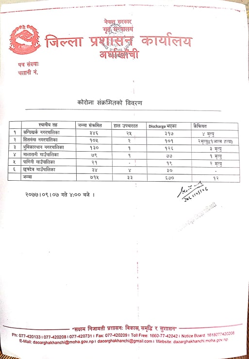सन्धिखर्क, अर्घाखाँची (अर्घाखाँचीडट्कम) । अर्घाखाँची जिल्लामा आजसम्म संक्रमितको संख्या ७१५ जना पुगेको छ । जसमा सन्धिखर्क नगरपालिकामा ३४६ जना, शितगंगा नगरपालिकामा १०५, भूमिकास्थान नगरपालिकामा १३०, मालारानीमा ७९, पाणिनी गाउँपालिकामा २१ र छत्रदेव गाउँपालिकामा ३४ जना संक्रमित रहेका छन् ।