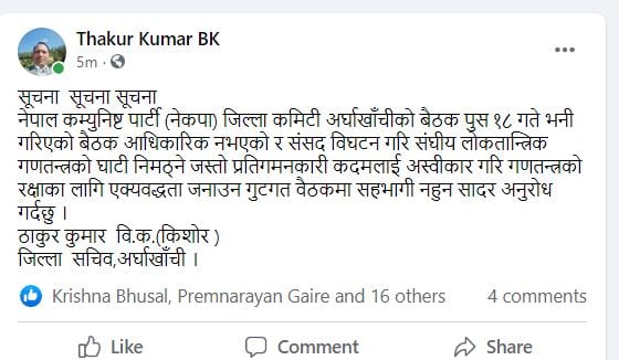 उता प्रचण्ड–नेपाल खेमाले अर्घाखाँचीमा कुनै बैठक आयोजना नगरिएको र बैठक आधिकारिक नभएको बताएका छ । सविक नेकपाका जिल्ला सचिव ठाकुर कुमार  विकले सुचना जरी गर्दै भनेका छन्;: नेपाल कम्युनिष्ट पार्टी (नेकपा) जिल्ला कमिटी अर्घाखाँचीकाे बैठक पुस १८ गते भनी गरिएकाे बैठक आधिकारिक नभएको र संसद विघटन गरि संघीय लाेकतान्त्रिक गणतन्त्रकाे घाटी निमठ्ने जस्तो प्रतिगमनकारी कदमलाई अस्वीकार गरि गणतन्त्रको  रक्षाका लागि एक्यवद्धता जनाउन गुटगत वैठकमा सहभागी नहुन सादर अनुरोध गर्दछु ।