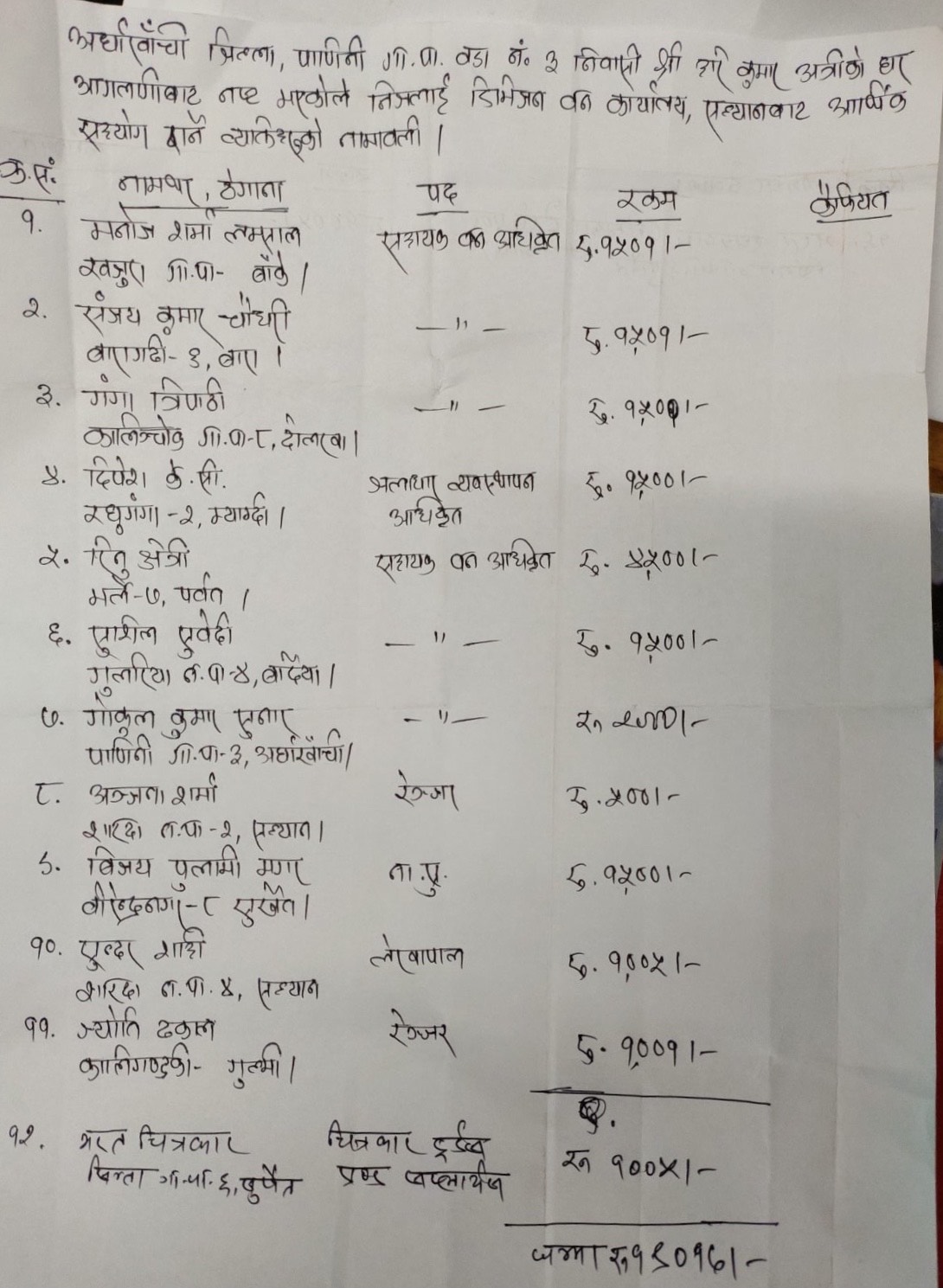 डिविज़न वन कार्यालय सल्यानमा कार्यरत गोकुल सुनारको पहलमा जम्मा भएको १९ हजार ५ सय २१ रुपैया पाणिनी गाँउ पालिका वडा नं ३का वडा अध्यक्ष देवी वहादुर क्षेत्री, पाणिनी पर्यटन समाज अर्घाखाँचीका अध्यक्षझविन सुनाम,उपाध्यक्ष धुर्वराज घिमिरे,सचिव केशव वन्जाडे,सदस्य पुस्करघिमिरे,पत्रकार चोलनाथ पौडेल,गोकुल सुनार का वुवा कृष्ण वहादुर सुनार,आमाउजेली सुनार र स्थानीयहरुको उपस्थितीमा अग्नि पिडित नारायणी अत्रिलाईविहिवार नगद सहयोग रक़म रु १९ हजार ५ सय २१ रुपैया हस्तांतरण गरिएको हो ।