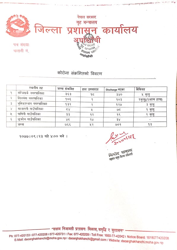सन्धिखर्कमा २ जना नयाँ संक्रमित थपिए, अर्घाखाँचीमा आजसम्म कोरोना संक्रमितको संख्या ७६६ जना पुग्यो (सम्पूर्ण विवरण सहित)