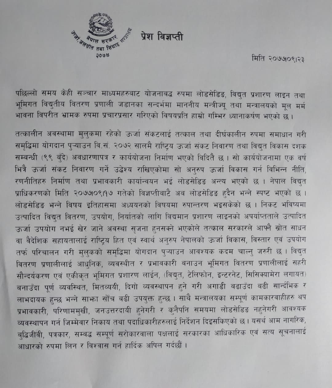 मन्त्रालयले विज्ञप्ति जारी गरी भ्रामक सूचना तथा जानकारीको पछाडि लागेर सत्य कुरा तोडमोड गर्न वा मन्त्रीको मर्मको गलत व्याख्या नगर्न पनि सर्वसाधारण तथा सरोकारवालालाई आग्रह गरेको छ । तत्कालीन समयमा ऊर्जा संकट अन्त्य गर्न ९९ बुँदे कार्ययोजना बनाएर सुरु गरेको हुँदा त्यसैको परिणाम पछिल्ला वर्षमा देखिएको विज्ञप्तिमा उल्लेख गरिएको छ ।