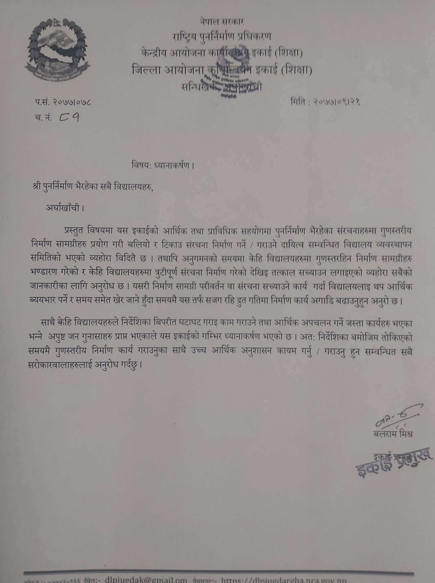 अर्घाखाँचीका विद्यालयहरुद्धारा गुणस्तरहिन सामान प्रयोग, जिल्ला आयोजना कार्यान्वयन ईकाईको असन्तुष्ट