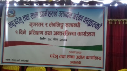 सन्धिखर्क, अर्घाखाँची (अर्घाखाँचीडट्कम) । अर्घाखाँची जिल्लाको सदरमुकाम सन्धिखर्कमा घरेलु तथा साना उद्योग कार्यालयको लघु घरेलु तथा साना उद्यमीहले उत्पादन गरेका वस्तुहरुको गुणस्तर लेवलिङ्ग सम्बन्धी १ दिने प्रशिक्षण तथा अन्तरक्रिया कार्यक्रम सम्पन्न भएको छ ।