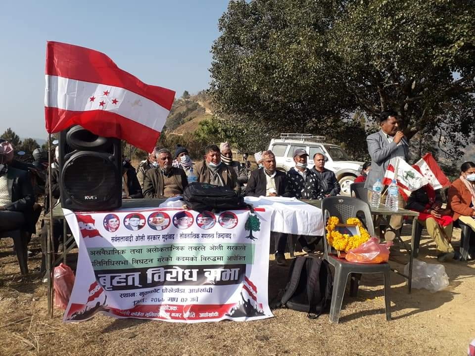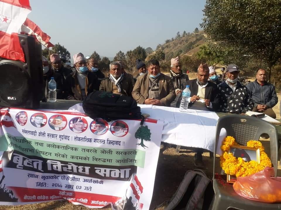 नुवाकोट, अर्घाखाँची (अर्घाखाँचीडट्कम) । अर्घाखाँची जिल्लाको नुवाकोटको पोखेडाँडामा प्रतिनिधि सभा विघटनको असम्भैधानिक र अलोकतान्त्रिक कदमाका विरुद्धमा नेपाली कांग्रेस भुमिकास्थान नगर कार्य समितिको आयोजनामा बृहत बिरोध सभा कार्यक्रम सम्पन्न भएको छ ।