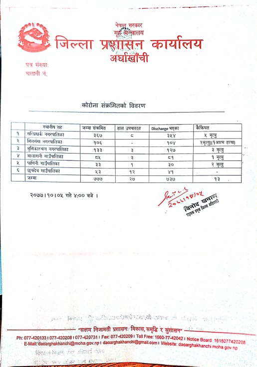 यस्तै जिल्लामा आजसम्म संक्रमितको संख्या ७७७ जना पुगेको छ । जसमा सन्धिखर्क नगरपालिकामा ३६७ जना, शितगंगा नगरपालिकामा १०६, भूमिकास्थान नगरपालिकामा १३३, मालारानीमा ८५, पाणिनी गाउँपालिकामा ३३ र छत्रदेव गाउँपालिकामा ५३ जना संक्रमित रहेका छन् ।