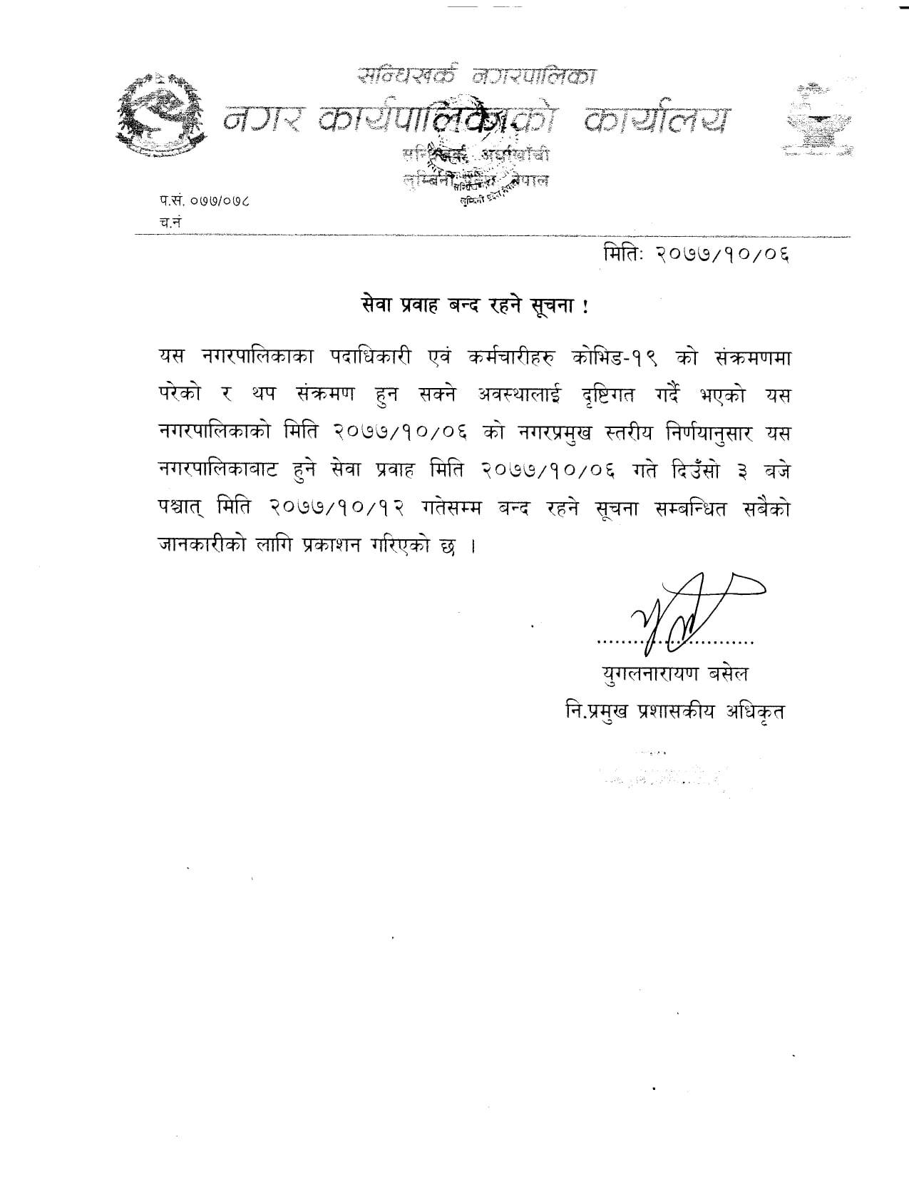नगरपालिका प्रमुख कमल प्रसाद भुसालसहित कर्मचारीहरुलाई कोरोना संक्रमण भएपछि नगरपालिकाको कार्यालयका सेवा एक हप्ताको लागि बन्द भएको हो ।