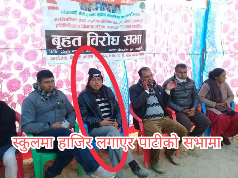 तर यस्त गतिबिधी शिक्षकलाई सामान्य हुने गरेका छन् बिहिबार समेत शुबाेधिनी माबिका शिक्षक बेल्बासे स्कुलमा पुगेर हाजिर भए र चारतारे झण्डा बाेकेर नारालगाउन हिडे । बिद्यालयमा प्रअलाई समेत कुनै जानकारी नदिइ उनी पार्टीको सभामा पुगेका हुन् । प्रअ बिदामा रहेकाे र निमित्त प्रअकाे जिम्मेवारी समेत पाएका दुर्गाले स्कुलमा हाजिर भएर बिराेध सभामा सभाकाे अग्रपंतीमा पुगे। हुनत दुर्गा बेल्बासे अहिले मात्र हैन हरेक कार्यक्रममा यसरी नै सहभागी हुने गर्दछन् । उनी गाउँमा शिक्षक भन्दा कांग्रेसका कार्यक्रताकाे रुपमा बढि चिनिन्छन् ।