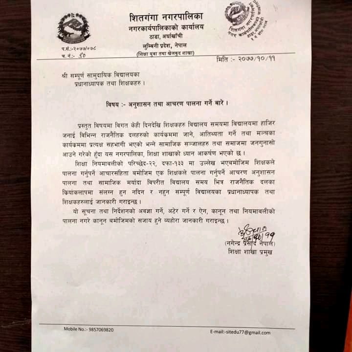 शितगंगा नगरपालिकाको शिक्षा शाखाले सोमबार नगरका विधालयहरुलाई पत्र लेखी अब राजनीतिक दलका कार्यक्रममा जाने शिक्षकलाई कारबाही गर्ने बताएको हो ।