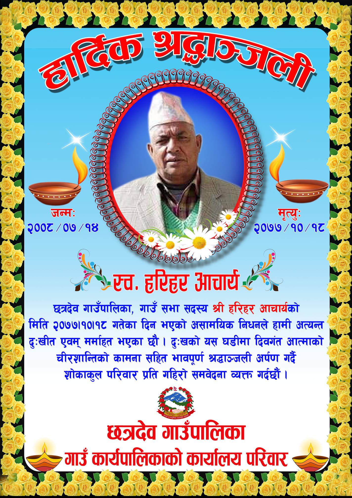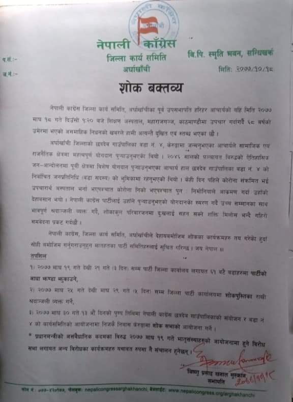 आचार्यको निधन प्रति छत्रदेब गाउँपालिका र नेपाली कांग्रेसले दु:ख व्यक्त गरेका छन् ।