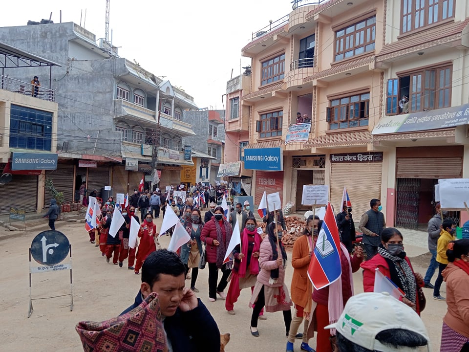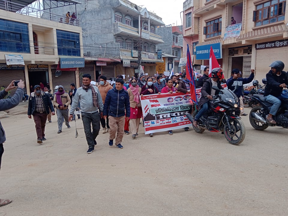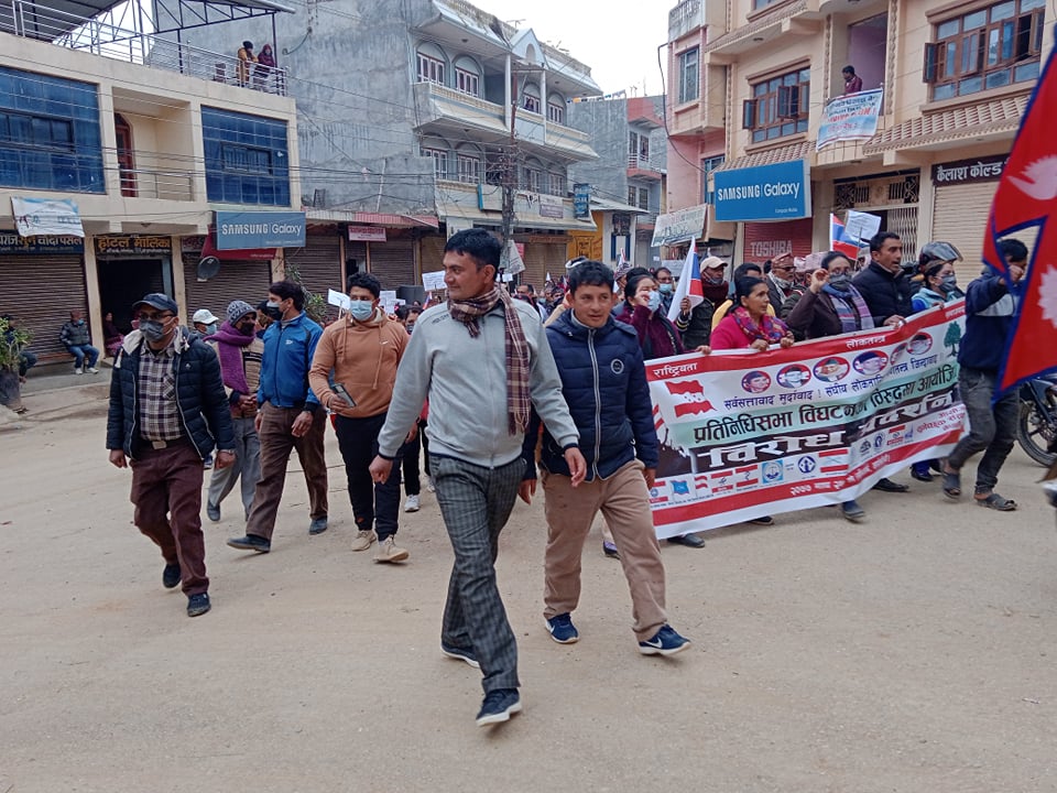 ओलि सरकारले प्रतिनिधि सभा विघटन गरे देखि काङ्ग्रेस विभिन्न तवरले सडकमा छ ।त्यसै अन्तरगत दोस्रो चरणको आन्दोलनका एक अंसका रुपमा आजको कार्यक्रम गरिएको हो ।जुलुस सन्धिखर्क र चुत्रबेसिका सबै गल्लिहरु परिक्रमा गरि शान्ती बगैंचामा आएर बिरोधसभामा परिणत भएको हो ।
