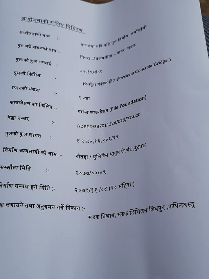 पुलको सगुन कन्ट्रक्सन प्रा. लि बुटवलले करिव एक महिना अघिदेखि  निर्माण कार्य गरिरहेको नगर उपप्रमुख टीका बहादुर रेश्मीले बताएका छन् ।