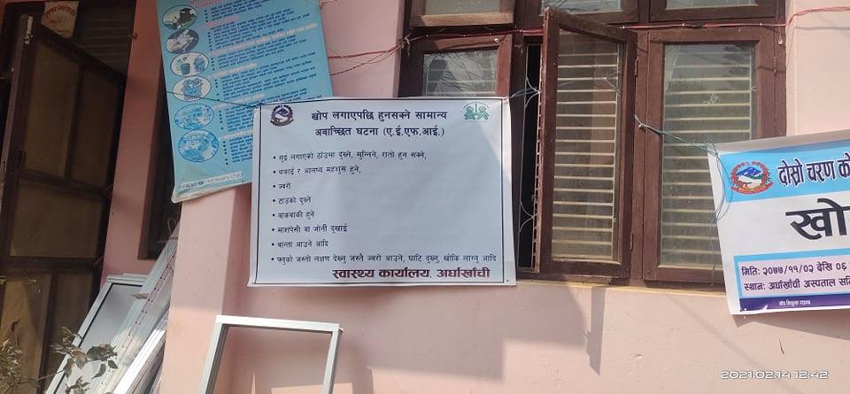 जिल्ला अस्पताल अर्घाखाँचीमा आज आईतबार सन्धिखर्क, भूमिकास्थान नगरपालिका अन्तरगत अर्घाखाँचीडट्कम सहित पत्रकार, सम्पूर्ण जनप्रतिनिधि, कर्मचारीहरु गरी १९० जनालाई कोरोनाविरुद्धको खोप लगाइएको थियो । अर्घाखाँचीडट्कमका प्रधान सम्पादक मेहर सिंह के.सी, सम्पादक सन्तोष के.सी, व्यवस्थापक प्रमुख बसन्त खड्का, संवाददाता केशब राज ज्ञवाली, दीपेन्द्र पौडेलले आज कोरोनाविरुद्धको खोप लगाएका थिए । साथै डट्कमका अन्य पालिकाका प्रतिनिधीहरुले सम्बन्धित पालिका तथा आगामी दिनमा खोप लगाउने छन् ।