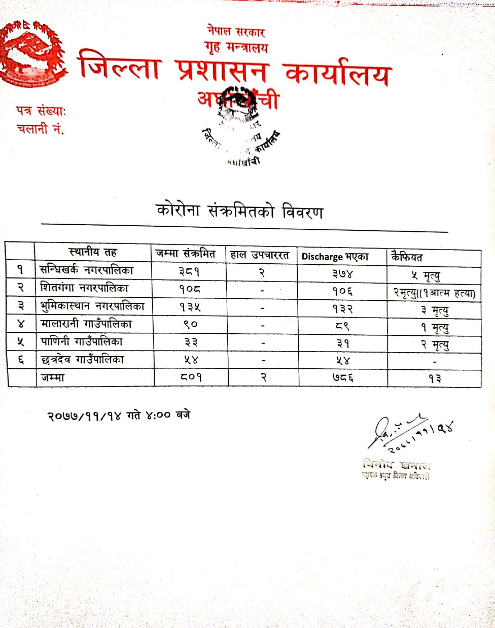 अर्घाखाँचीडट्कमको विवरण अनुसार जिल्लामा कोरोनाका कारण १४ जनाको निधन भएको छ ।
