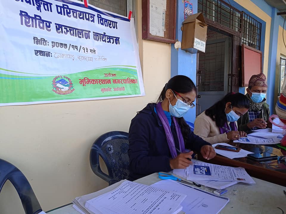 ढाकावाङ, अर्घाखाँची (अर्घाखाँचीडट्कम) । अर्घाखाँची जिल्लाको भुमिकास्थान नगरपालिकाले नगरको वार्ड नं. ५ असुरकोट र ६ खिल्जीमा अपाङ्गता भएका व्यक्तिहरुलाई परिचयपत्र वितरण गरेको छ ।