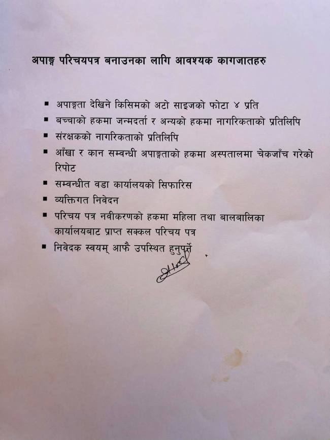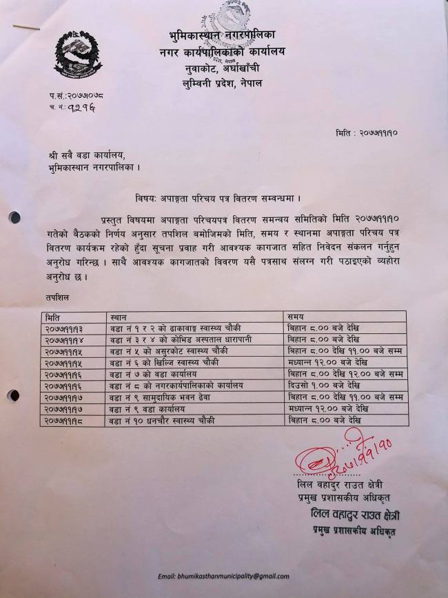 नगरभित्रका सवै वडामा पुगि परिचयपत्र बितरण गर्ने योजना बनाएको नगरपालिकाले सनिवार दुबैवडाका २२ जना अपाङ्गता भएका व्यक्तिहरुलाई परिचयपत्र वितरण गरेको नगरपालीकाका कम्प्युटर अपरेटर शेषकान्त घिमिरेले जानकारी दिनुभयो ।